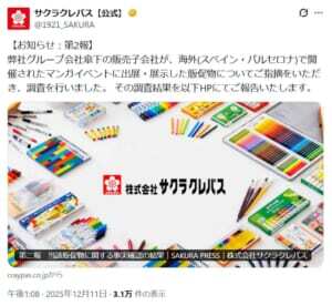 株式会社サクラクレパスは12月11日、スペイン・バルセロナで開催されたマンガイベントにて展示された販促物に関する調査結果の「第二報」を公表しました。