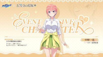 今回開催される『五等分の花嫁』コラボでは、中心キャラクターである「中野 一花」、「中野 二乃」、「中野 三玖」、「中野 四葉」、「中野 五月」が本作に参戦する。もちろんゲーム内にて新得されている音声の声優も、アニメおよび劇場版と同じく花澤香菜さん、竹達彩奈さん、伊藤美来さん、佐倉綾音さん、水瀬いのりさんがそれぞれ担当している。