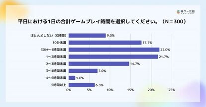 平日の1日当たりのゲームプレイ時間は、30分〜1時間が22%で最多という結果でした。