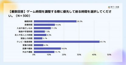 ゲーム時間を調整する際に優先して削る時間は、テレビ/動画視聴の時間が43.7%で最多でした。