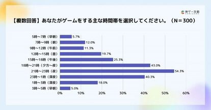 ゲームプレイする時間帯の調査では、21〜23時が54.3%で最多の結果となりました。