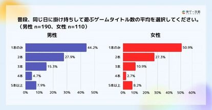 同日に掛け持ちして遊ぶゲームタイトルの数は、男女別の調査では、1本のみの回答に若干の差があるものの、全体的にほぼ回答に差がない結果となりました。