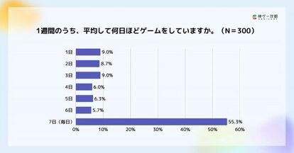 10代〜40代のゲームユーザー300名を対象にしたアンケートによると、1週間のうち「毎日ゲームをする」と回答した人は約55.3%にのぼり、ゲームが日常に定着していることが明らかになりました。