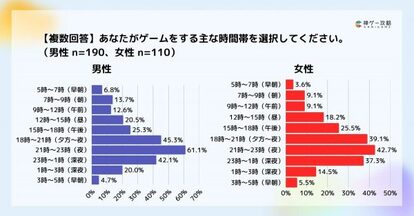 一方で、遊ぶ時間帯は男女ともに「21時〜23時」が最多(54.3%)という共通点も見られました。