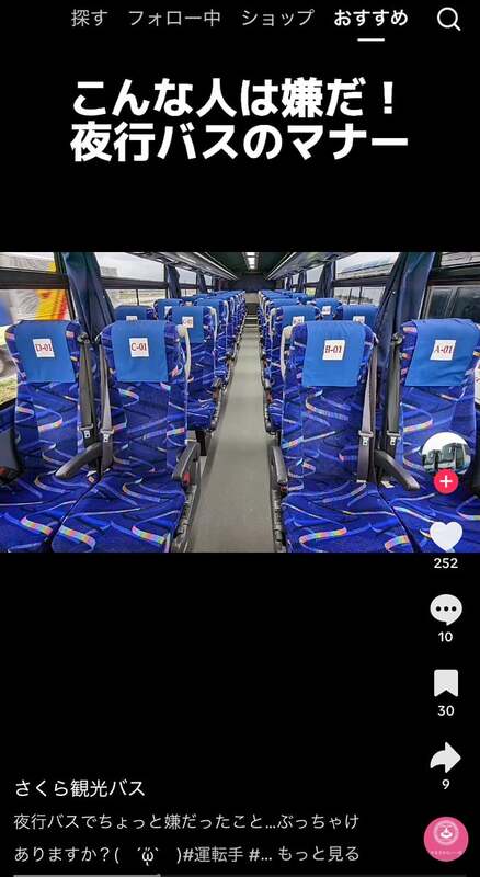 夜行バスでマナー違反に該当する行為について、高速バス事業や貸し切りバス事業を手掛けるさくら観光バス(埼玉県久喜市)が、公式TikTokアカウントで紹介しています。