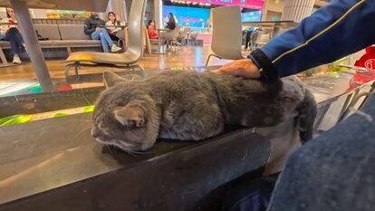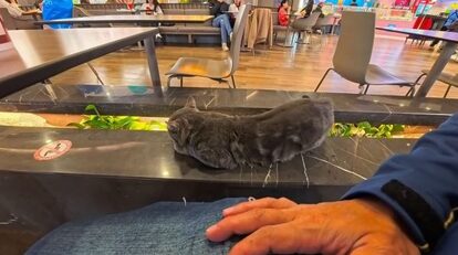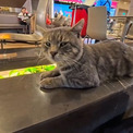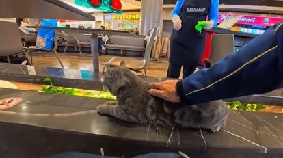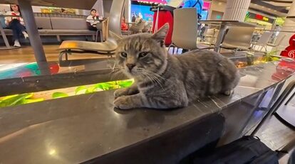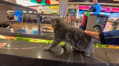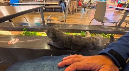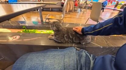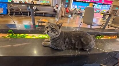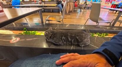 『フードコートで飯食ってたら猫が隣に来て一緒にくつろぎ始めた件w 癒やしが過ぎる』