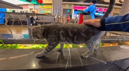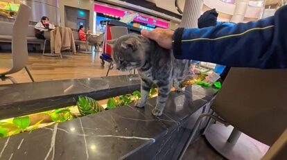 海外旅行中の投稿者の感動猫動画さん。フードコートでご飯を食べていると猫ちゃんがトコトコとやってきました。