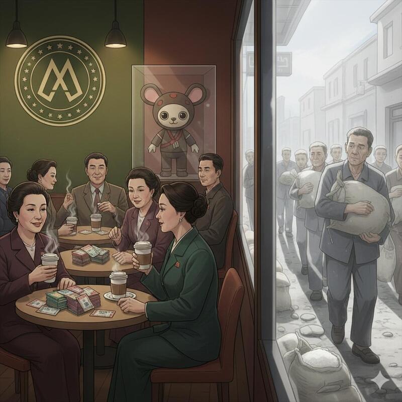 北朝鮮にも、スタバがある…よく見てみると「なんちゃってスタバ」のミレリザーブというカフェで、スタバのロゴの星の部分にアルファベットのMが置かれている。比較して申し訳ないが、鳥取県の「スナバ」のような自虐ではないのだ。うちが本家であるように北朝鮮の平壌で、お金出せる層には大人気なのだ。