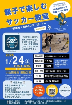 小山田緑地では2026年1月24日(土)、J1プロサッカークラブ「FC町田ゼルビア」所属コーチが指導する「親子で楽しむサッカー教室」を開催します。シュートやドリブルのコツはもちろん、サッカーの面白さなど「FC町田ゼルビア」所属コーチから直接指導が受けられる貴重なチャンスです。サッカーの技術向上にも、サッカーを始めるきっかけにもおススメです。