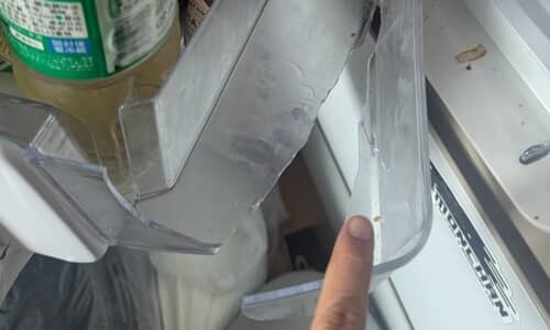 投稿したのは、Xユーザーの「さくやの」(@PGM_Hecate_II)さん。ある日、自宅の冷蔵庫のドアポケットが一部壊れてしまいました。破損箇所はチューブなどの小物をしまうのに便利な最前列の部分。側面から底面にかけて、ものの見事に割れています。