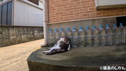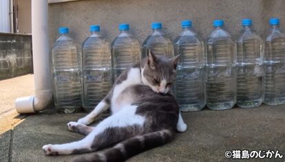 並んだペットボトルの先頭では猫ちゃんが毛づくろい中でした。水の入ったペットボトルは猫よけとして使われることがありますが、効果は薄いとされています。こちらの猫ちゃんはむしろもたれてリラックスしていますね。