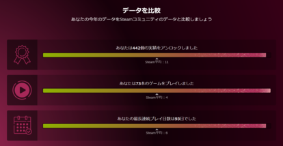 年間のハイライトをはじめ、自身のデータとコミュニティとの比較、プレイするゲームの傾向、今年プレイしたゲームの月別まとめといったさまざまな情報を確認することが可能だ。