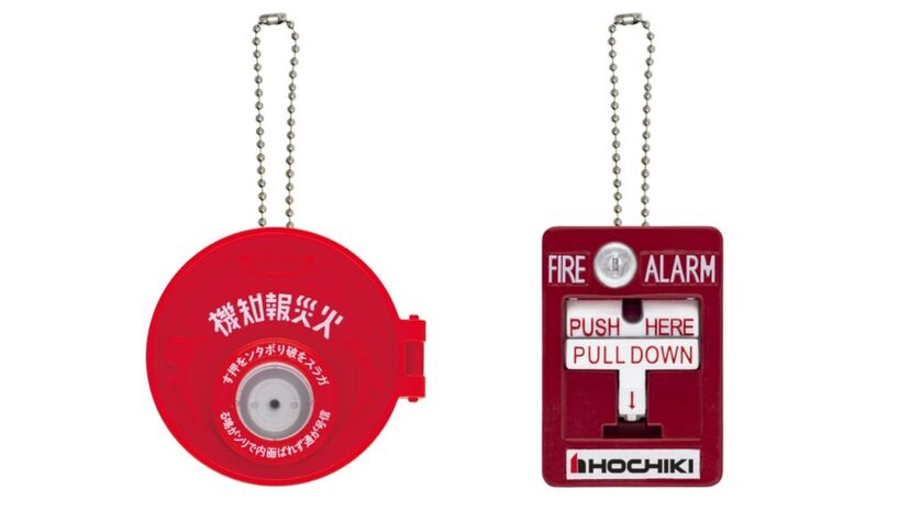 学校や商業施設などで目にする自動火災報知設備の発信機を精巧に再現しました。実物にそっくりの音や光のギミックも搭載しました。小さい頃から「火事の時にしか押したらダメ」と言われていたあのボタンを押して楽しめます。さらに、付属のボールチェーンで鞄やポーチに付けることもできます。