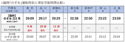 これは20:09東京駅発の新大阪行き定期列車を利用の多い日に臨時列車として広島駅まで延長運転するというもの。広島駅行きの最終定期列車20:00東京駅発「のぞみ89号」の後に設定され、20:09に東京駅を出発、23:59に広島駅へ到着します。これにより、広島駅まで利用する場合の首都圏での滞在可能時間が最大11分拡大。より長く滞在できるようになります。