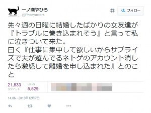 渦中のカップルは、つい最近結婚したばかりの新婚さん。妻は、結婚前から夫がネトゲに熱中していることを知っていたそうです。でも結婚後になり「仕事に集中して欲しいから」という理由で、夫が遊ぶネトゲアカウントを勝手に消してしまったとのこと。結果、激怒されて離婚を申し込まれているそうです。