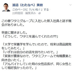 ワタミ創業者の渡邉美樹氏が、この春ワタミに入社した新人に贈った言葉が話題となっている。渡邉氏は、4月11日にフェイスブックを更新。「昔と違うだろ…と言われるかもしれませんが」と前置きし、こうメッセージを贈った。