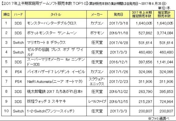 ゲーム総合情報メディア「ファミ通」は4日、2017年上半期(2016年12月26日から2017年6月25日まで)の家庭用ゲームの市場規模を発表した。