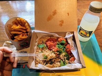 中でも人気メニューだという「Sicilian Chicken Meatballs(シチリアン・チキン・ミート・ボール)」は、イタリアン・ロング・グレイン・ライスの上に、レオン特性のトマト・ソースがからんだチキン・ミート・ボールが5つ、その上にフレッシュ・バジルのペスト(Pesto、ジェノバソース)が乗り、色のコントラストが食欲をそそる一品。