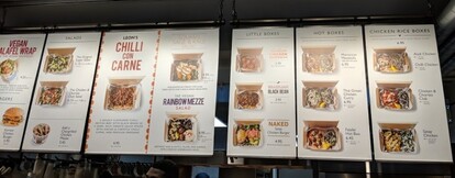 午前11時以降はオール・デイ・メニューとして、各種チキンと玄米、チキンやベジタリアンのラップ・ロール、ボリュームのあるサラダ類、ミート・ボールに食感が似たヒヨコ豆のコロッケ・ファラフェル、ベイクド・フライなど、目移りしてしまうほど多種多様で健康そうなメニューが盛りだくさん。子供サイズのメニューもあります。