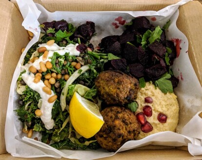 タイムでローストしたビーツ、ミントとパセリ、青汁の原料にも使われる健康野菜ケール、レンズ豆、ロースト松の実が乗ったサラダにホースラデッシュのドレッシングがかかり、スイートポテトのファラフェル、ザクロが乗ったひよこ豆のペーストであるフムスなどが、一箱にギュッと詰まっています。