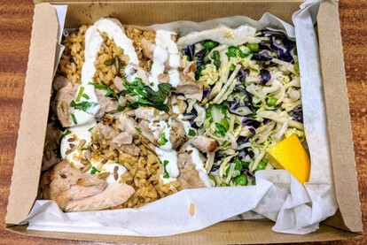チキンをガッツリと、同時にサラダもいただきたい人にお勧めしたいのが、「Chargrilled Chicken Aioli Hot Box(チャーグリルド・チキン・アリオリ)」。ライスの上に炭火焼のチキン、にんにくの風味が食欲をそそるアイオリ・ソース、ハーブやキャベツ、グリーンピースのフレッシュ・サラダを添えた一品です。