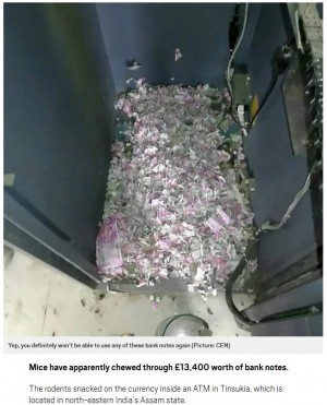 ATM内には大量の2,000ルピー札と500ルピー札が入っていたが、ネズミには金の価値などわかるはずもなく、閉ざされたマシンの中で札をボロボロにしてせっせと巣作りに励んでいたのであろう。銀行側にとっては恐らく笑い事では済まされない事態だが、このニュースを知ったツイッターのユーザーらからは笑いが漏れていたようだ。