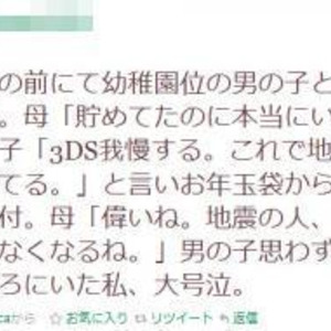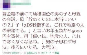 このエピソードは、幼稚園児が寄付をするシーンを目撃した『Twitter』ユーザーにより書き込みされたもの。幼稚園児は母親と募金箱の前で話し合い、『ニンテンドー3DS』ではなく寄付をするという選択肢を選んだのです。『Twitter』に書かれていたエピソードの全文は以下のとおりです。