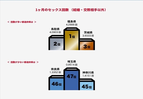 結婚・交際相手以外とのセックスランキングでは、福島県が1位に。つまり浮気相手とのセックス回数である。その数は一ヶ月で4.2回。