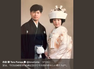 声優の古谷徹(65)が3月24日、Twitterに「実は、今日は34回目の結婚記念日。その昔の初々しい僕たち」と結婚式での和装姿を公開した。新郎新婦のツーショットにフォロワーから「なんて素敵なお写真 34回目の結婚記念日おめでとうございます」、「おめでとうございます お、お若い!! 今もステキです」など多くの祝福があった。