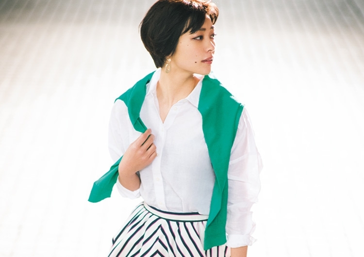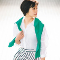 斜めストライプのスカートは、メリハリ配色でよりすっきりシャープな印象に。きちんと見えする白シャツにカーデを肩掛けして、モノトーンコーデに差し色をプラスします。パキッとしたグリーンのカーデで縦ラインを強調して、よりスタイルアップ効果を高めて。バッグはかっちり系が◎。