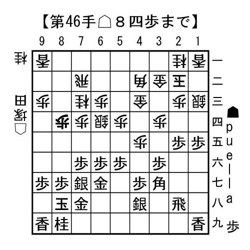 というわけで、興味ははたしてPuella αが▲7七玉と指すか、の一点にかかった。それにしても、見ていてうんざりする場面である。疲れが出て、エレベーター前の老人席で一服つけながら、あれでもし後手が勝ったとしても、本当に勝ったと言えるのだろうか、と思った。