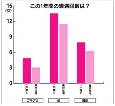 住居形態別で、この1年間の「ゴキブリ」「蚊」「蜘蛛」の平均遭遇回数は、「ゴキブリ」の平均遭遇回数は、一戸建てが平均4.89回。それに対して、集合住宅は3.08回だった。「蚊」は一戸建てが13.58回、集合住宅が11.53回。「蜘蛛は」一戸建てが7.96回、集合住宅が6.33回だった。わずかではあるが、一戸建ての方がマンションより遭遇回数が多いようだ。