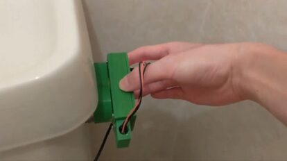 外装は3Dプリンタで作られています。レバーハンドルにピッタリの大きさにするのが大変だったそう。トイレにコンセントがなかったため、バッテリーで駆動します。待ち時間はスリープになるので、持ちはよさそうです。