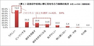 今回の調査結果から、女性の84.0%(既婚女性の85.1%、未婚女性の80.0%)が、「相手を好きになる」「相手を見直す」「うれしい」などのいずれかを選び、花をもらった相手に対し、ポジティブで好意的な意識を持つことが分かった。また、花をもらう瞬間「ビックリする」と答えた女性が24.2%おり、驚きながらも少なからず女性の心が動いていることがうかがえる。