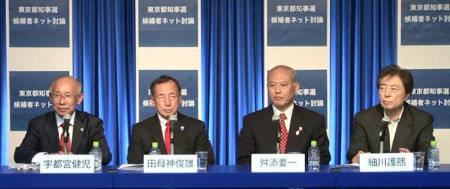 東京都知事選(1月23日告示、2月9日投開票)に立候補をしている宇都宮健児氏、田母神俊雄氏、舛添要一氏、細川護熙氏(届け出順)の4候補者が登壇する「東京都知事選挙 候補者ネット討論」が2014年2月1日夜、都内でおこなわれた。