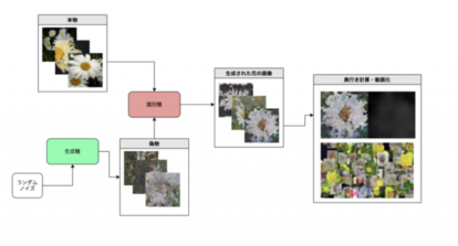 本システムの主眼となるモデル部分で使用されているのは、GAN(Genera tive Adversarial Networks:敵対的生成ネットワーク)技術。用意されたデータから特徴を学習することで、実在しないデータを生成したり、存在するデータの特徴に沿って変換したりすることが可能です。花の生成に関しては、バイラルワークス開発・学習のAIモデルを、その他の風景に関しては公開済みのあらかじめ学習されたモデルが使用されています。
